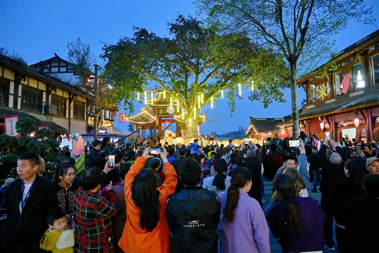 近年来,元通古镇以清明春台会为核心IP,积极探索“非遗+”融合路径。尤其在延续春台会要有戏台的传统习俗上,引进了国内知名喜剧团队“开心麻花”,推出了沉浸式体验演艺《会馆往事》《捞金晚宴》《锦城绮梦》等剧目。这些免费惠民演出涵盖即兴喜剧、肢体剧等多种形式,为传统节庆注入了新鲜艺术活力。