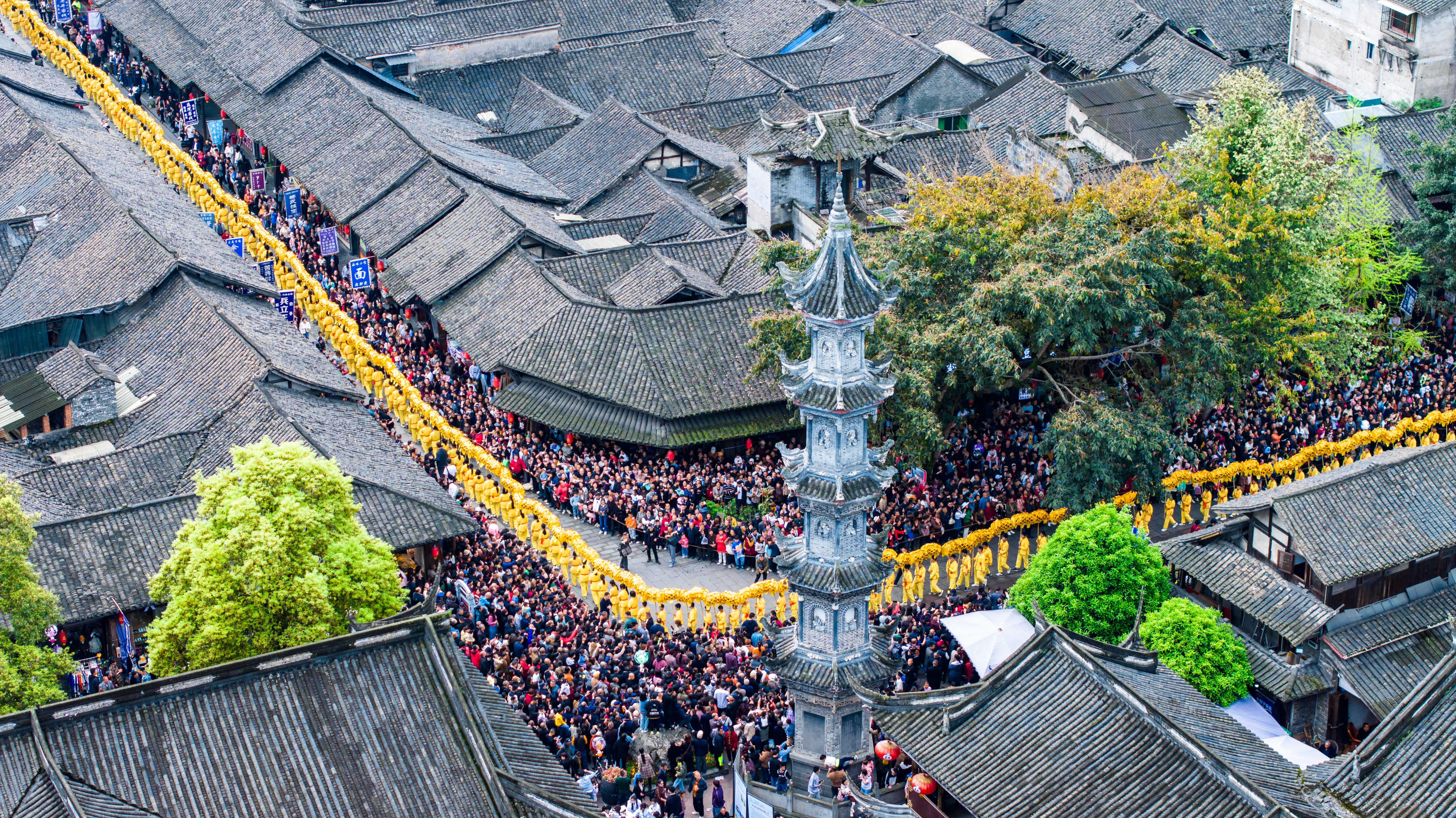在成都崇州的元通古镇,清明时节不仅有雨纷纷的诗意,还有一场持续了300多年的盛大民俗活动,元通古镇清明春台会被誉为“川西坝子第一会”,也有着“活着的《清明上河图》”的美称。2018年,春台会被列入四川省非物质文化遗产代表性项目名录,其最为壮观的“汇江老龙”巡游闻名遐迩,每年吸引着大量游客到访。